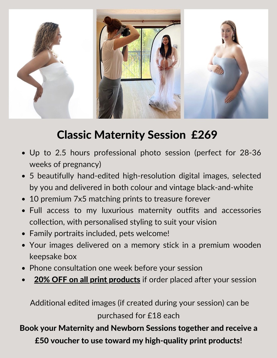 My package includes a variety of stunning maternity outfits and accessories, personalised styling and professional guidance to capture your unique journey with elegance and grace.Book your session today and let’s create beautiful, timeless memories of this special time in your life! 📸✨