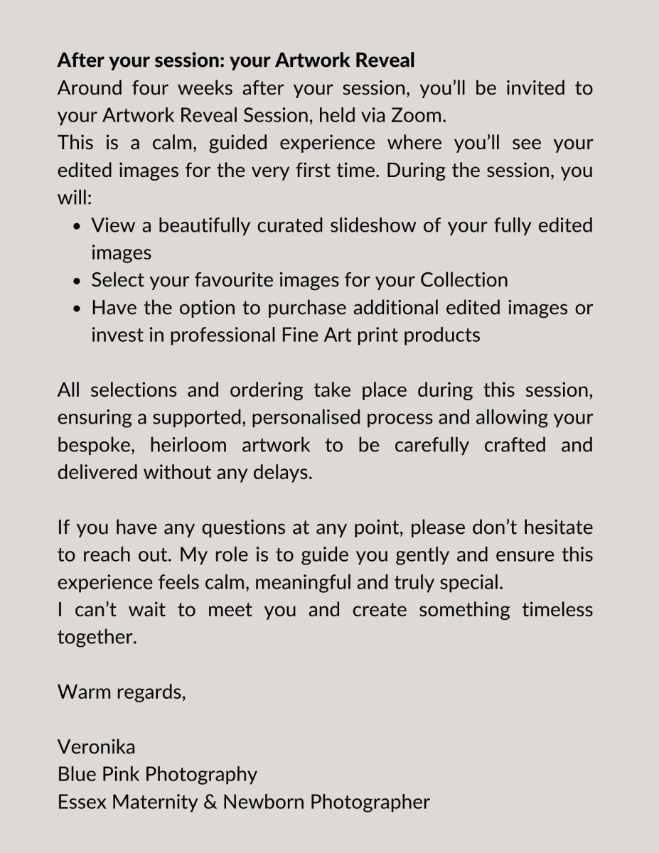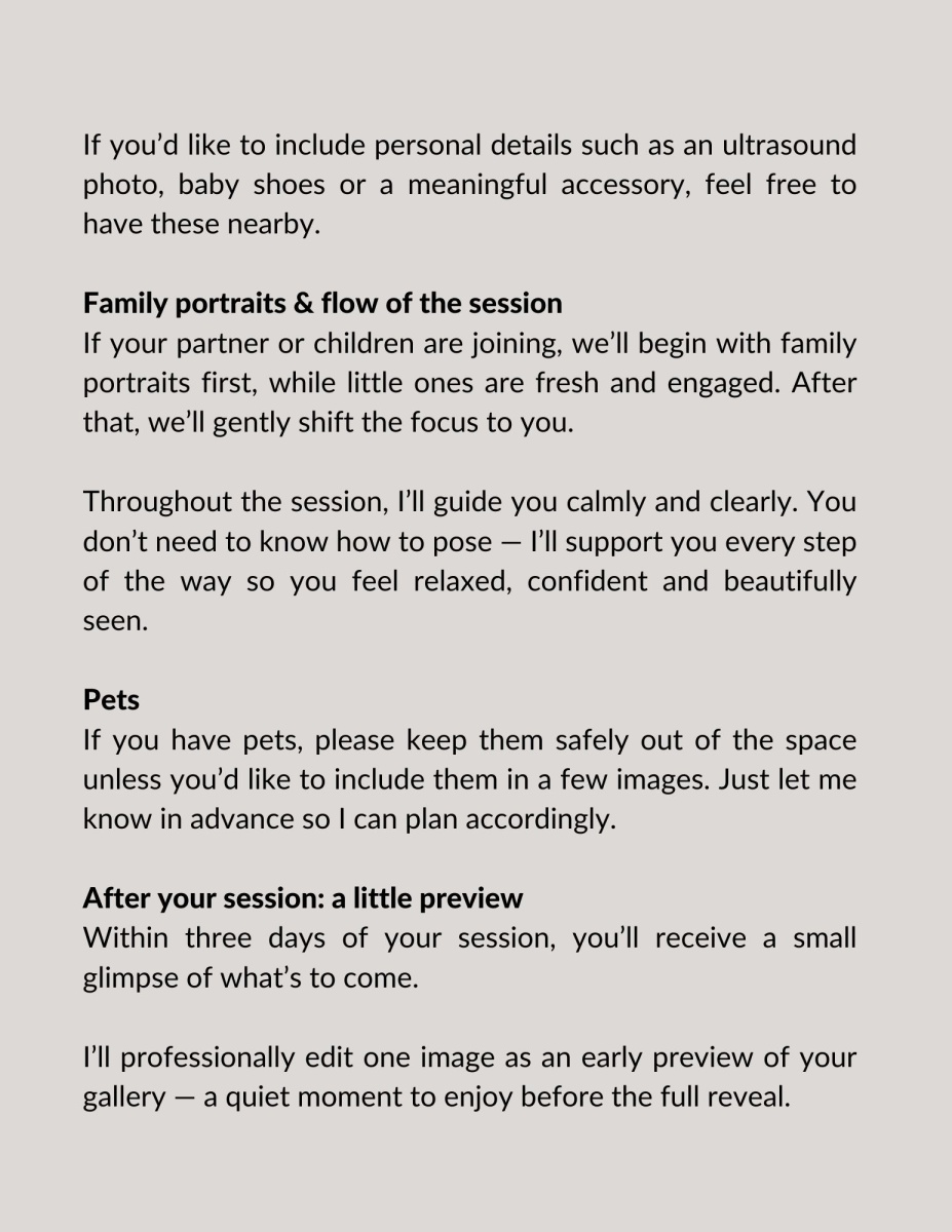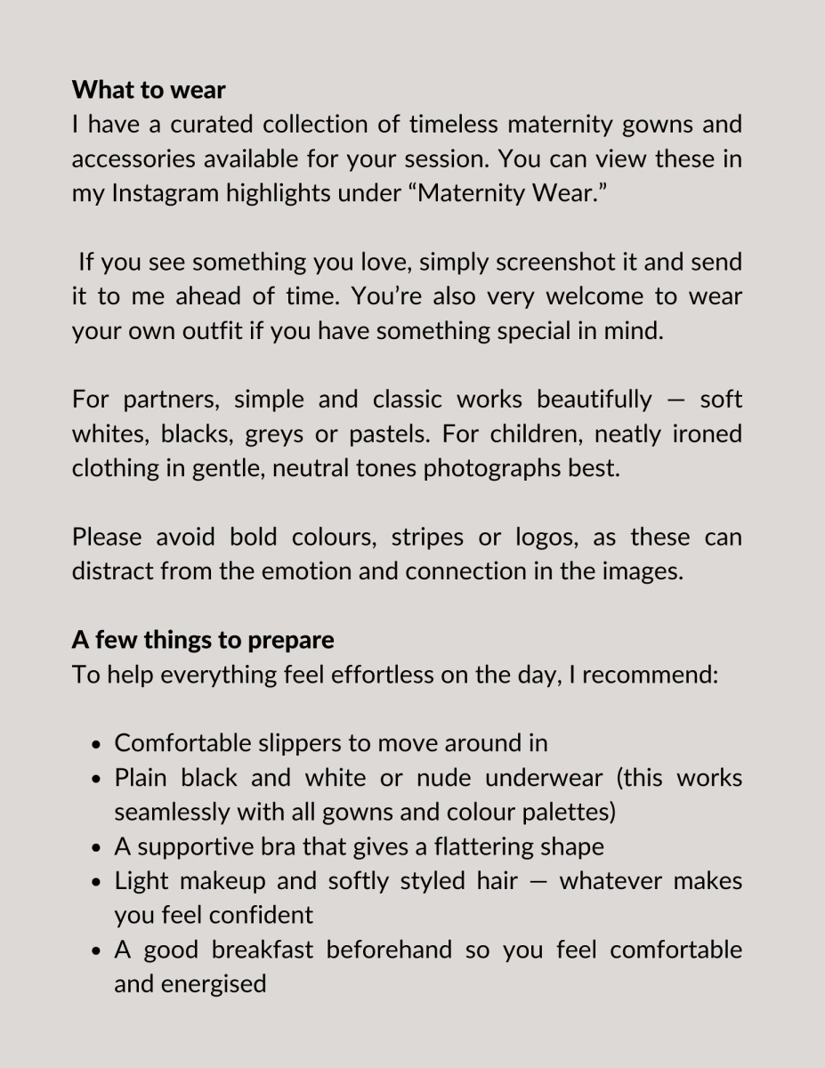 When you book a maternity photo session with me, you can expect a relaxed, personalised and professional experience.